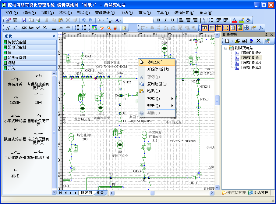 配電網絡管理可視化系統,是按《電氣符號國家標準》提供統一的電網圖標設計,具有強大的繪圖功能、饋線圖管理功能、饋線圖的審批流程、在線修改饋線圖、實時查看饋線圖、設備與圖紙緊密結合、完整的資產管理與強大的資產信息查詢與統計功能、電力用戶信息管理、停電分析功能、線損計算功能等。